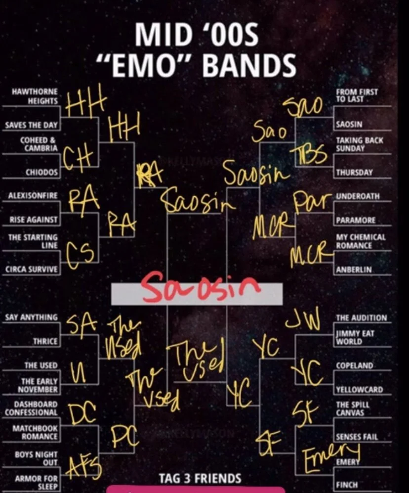 My younger sister is 17, and I often wonder what music she’s currently listening to that will have a home in her playlists for the rest of her life. For me, it’s the emo music of Warped Tours past. I recently completed the “Mid 00s Emo Bands” roster that was making its way across social media platforms.